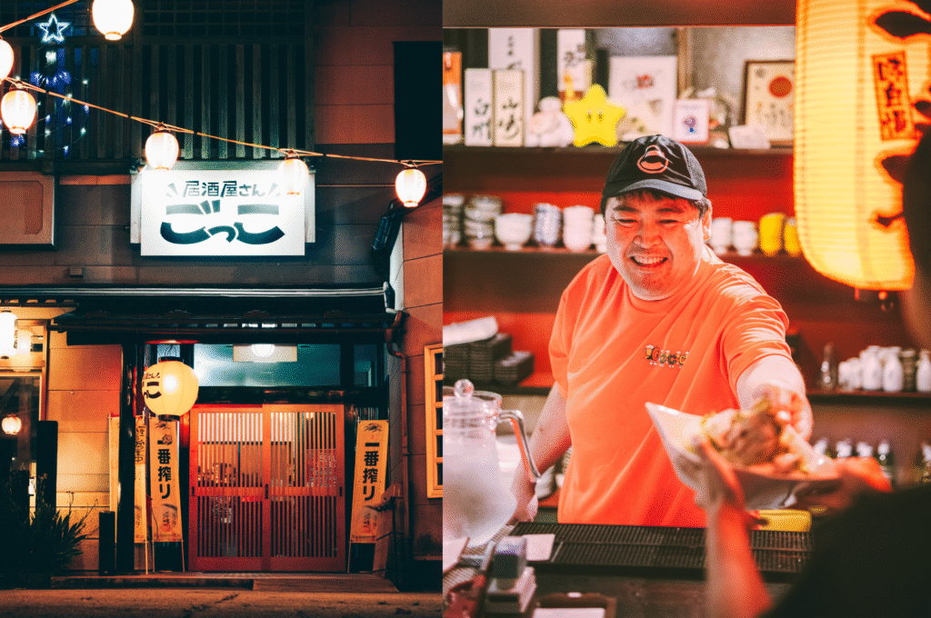 ホテルから徒歩約10分。色とりどりの提灯が目印の「居酒屋さんごっこ」。笑顔の素敵な店主と、豊富なメニューが魅力です。季節ごとに変わるお通しと店主一押しの餃子は特におすすめ。お酒を飲む方も飲まれない方も、お一人でもご家族でも、どんな方でもきっと満足できる温かいお店です。